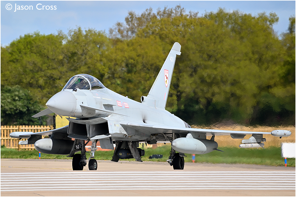 Royal Air Force Eurofighter Typhoon FGR4 ZK431 (with 29 Squadron markings) entering the runway for departure at RAF Coningsby. Date: 17 April 2024 Manipulation Notes: None