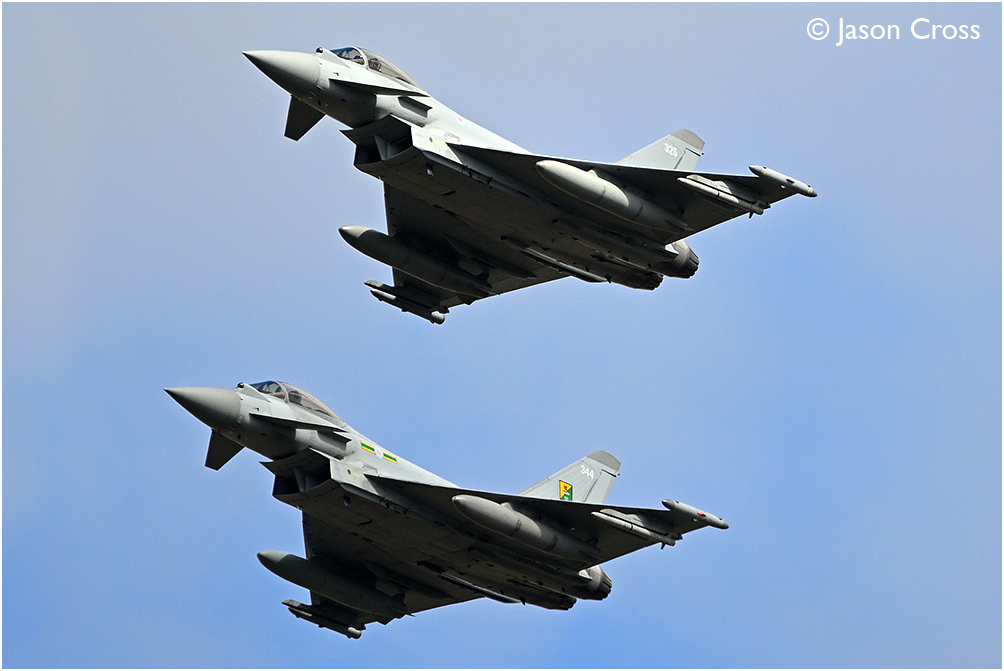 Royal Air Force Eurofighter Typhoon FGR4s ZK325 and ZK344 enter the circuit above RAF Coningsby. Date: 17 April 2024 Manipulation Notes: None