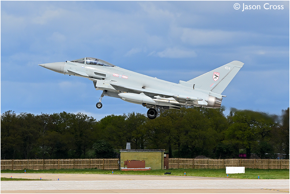 Royal Air Force Eurofighter Typhoon FGR4 ZK424 (carrying 29 Squadron markings) about to touch down on runway 25 at RAF Coningsby. Date: 17 April 2024 Manipulation Notes: None