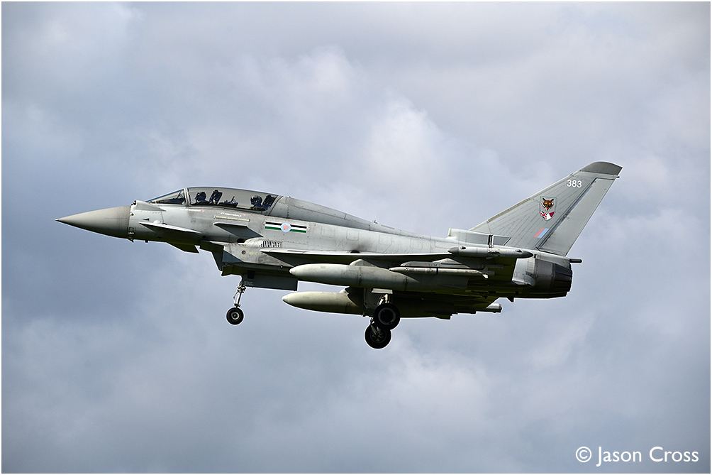 Royal Air Force Eurofighter Typhoon T3 ZK383 (carrying 12 Squadron markings) on approach to runway 25 at RAF Coningsby. Date: 17 April 2024 Manipulation Notes: None
