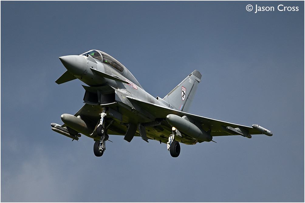 Royal Air Force Eurofighter Typhoon T3 ZK381 (carrying 29 Squadron markings) on approach to runway 25 at RAF Coningsby. Date: 17 April 2024 Manipulation Notes: None