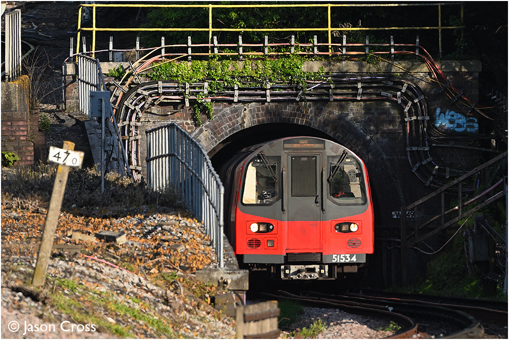 51534 exits the tube tunnel at East Finchley with a Morden to High Barnet Northern Line service. Date: 4 May 2024 Manipulation Notes: None