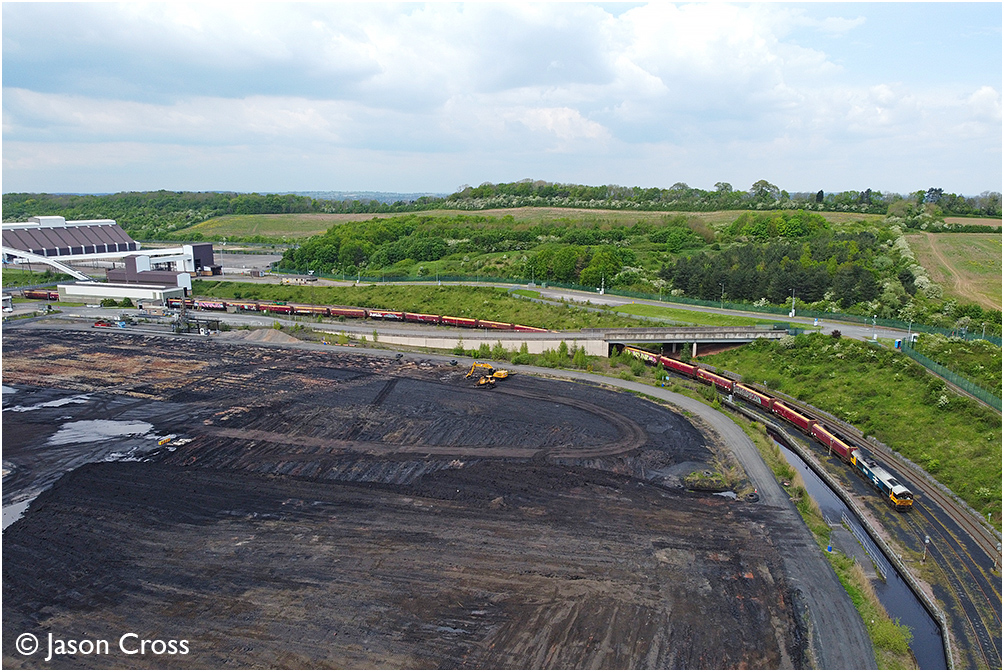 66789 draws the 6M61 0827 Barnetby to Ratcliffe Power Station through the unloading facility at Ratcliffe on Soar Power Station. Date: 6 May 2024 Manipulation Notes: None Photo taken from a drone