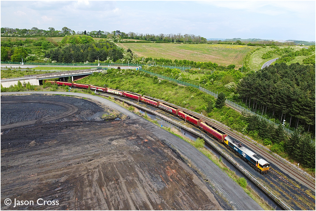 66789 draws the 6M61 0827 Barnetby to Ratcliffe Power Station through the unloading facility at Ratcliffe on Soar Power Station. Date: 6 May 2024 Manipulation Notes: None Photo taken from a drone