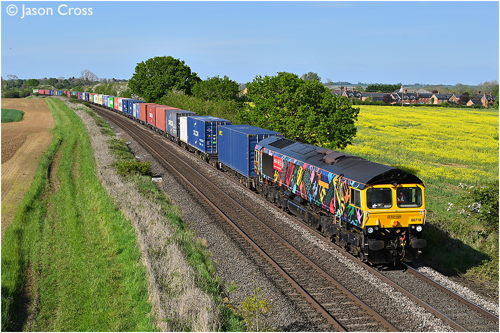 66718 approaches Langham Junction with the 4L07 1440 Birch Coppice to Felixstowe North container train. Date: 9 May 2024 Manipulation Notes: None Camera mounted on a tall pole and remotely fired