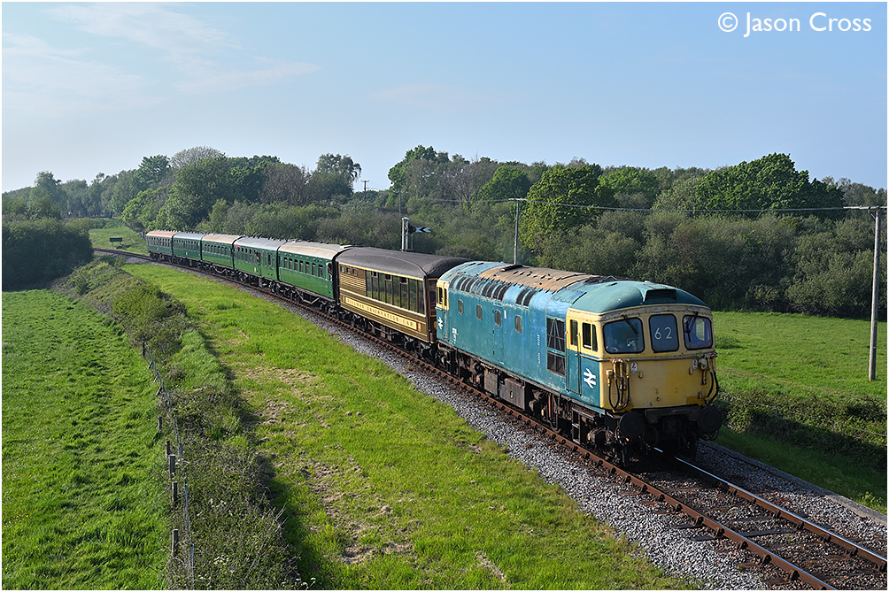 33111 approaches Castle View Crossing at Corfe Castle with the 1735 Norden to Swanage. Swanage Railway Diesel Gala. Date: 12 May 2024 Manipulation Notes: None Camera mounted on a tall pole and remotely fired