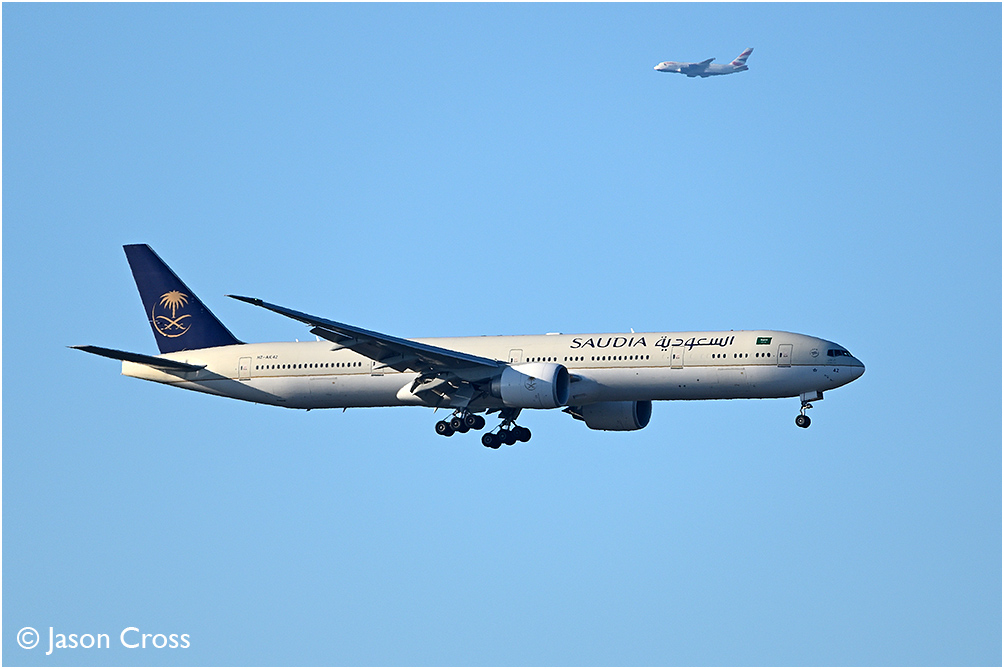 Saudia Boeing 777 HZ-AK42 on final approach to runway 27L at Heathrow Airport with flight SV119 from Riyadh. Date: 9 June 2024 Manipulation Notes: None