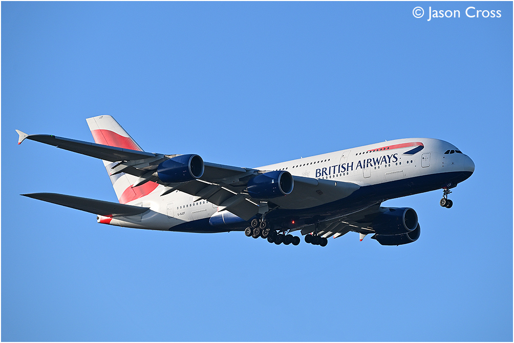 British Airways Airbus A380 G-XLEF on final approach to runway 27R at Heathrow Airport with flight BA212 from Boston. Date: 9 June 2024 Manipulation Notes: None
