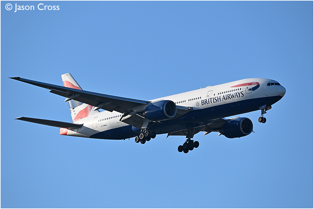 British Airways Boeing 777 G-YMMJ on final approach to runway 27R at Heathrow Airport with flight BA32 from Hong Kong. Date: 9 June 2024 Manipulation Notes: None