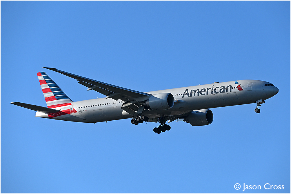 American Airlines Boeing 777 N732AN on final approach to runway 27R at Heathrow Airport with flight AA106 from New York JFK. Date: 9 June 2024 Manipulation Notes: None