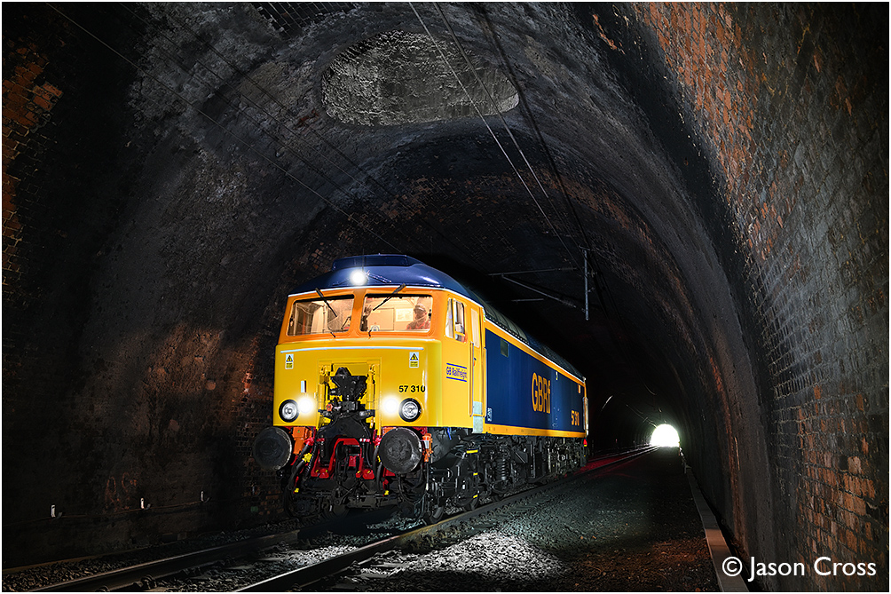 Freshly painted GB Railfreight class 57 number 57310 is captured under one of the vent shafts inside Saxelbye Tunnel. The loco was returning to Asfordby Test Centre (RIDC Melton) from Old Dalby. Date: 11 June 2024 Manipulation Notes: None