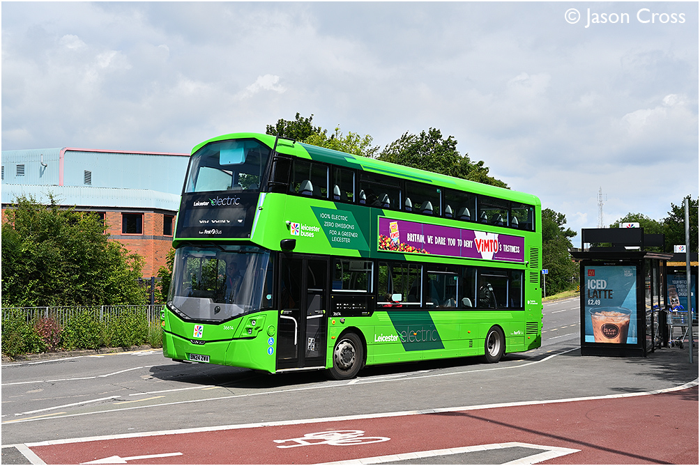 Wright Electroliner 36614 leaves the Beaumont Centre in Leicester with a 54 service for Leicester Haymarket Bus Station. Date: 16 June 2024 Manipulation Notes: None