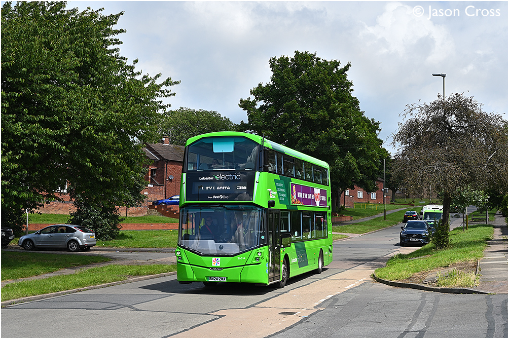 Wright Electroliner 36614 on Halifax Drive in Leicester with a 54 service from Beaumont Centre to Leicester Haymarket Bus Station. Date: 16 June 2024 Manipulation Notes: None