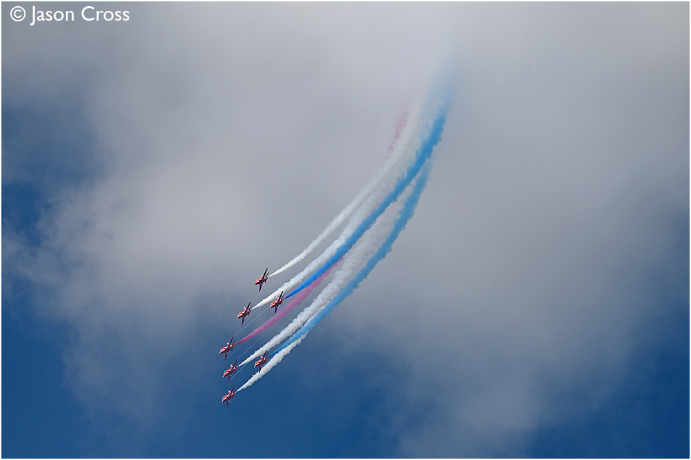 Emerging from a cloud - the Royal Air Force Aerobatic Team, The Red Arrows, Hawk T1s. Sywell Airshow 2024. Date: 23 June 2024 Manipulation Notes: None