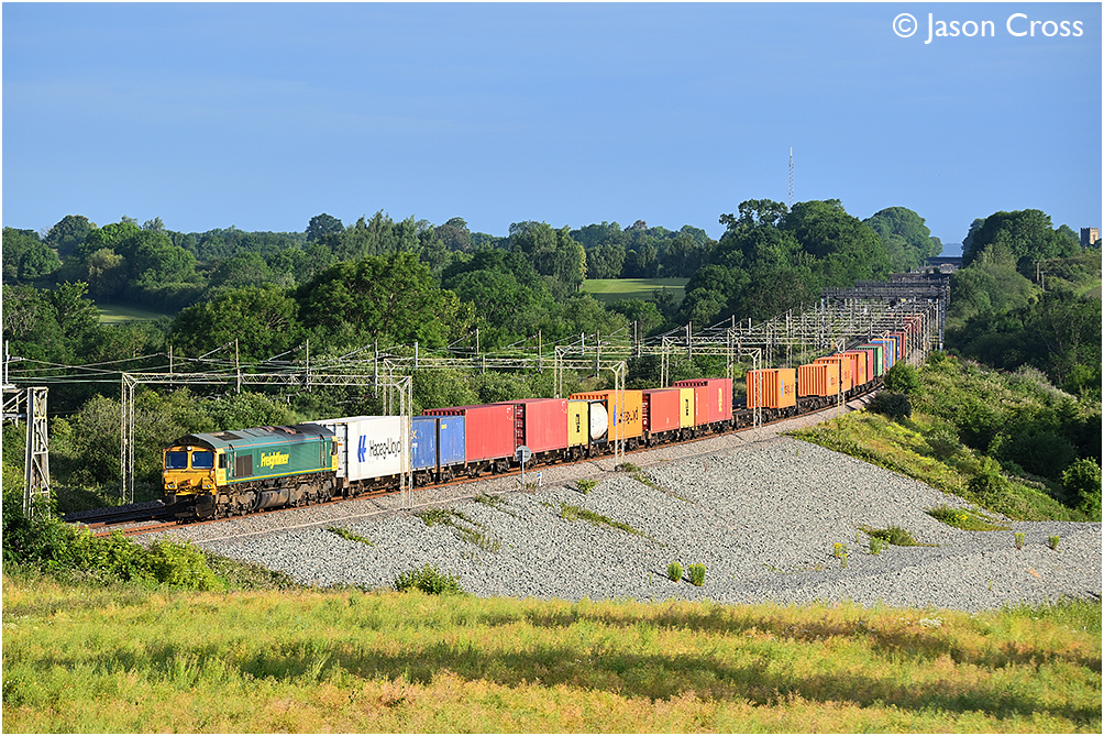 66507 at Nettle Hill near Shilton with the 4L52 0520 Basford Hall Yard to Wembley Receptions 1-7 container train. Date: 29 June 2024 Manipulation Notes: None