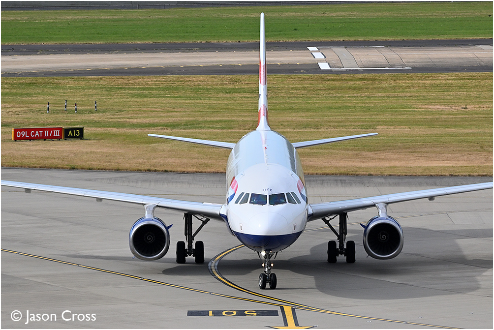 British Airways Airbus A320 G-EUYC arriving at its stand with flight BA1455 from Edinburgh. London Heathrow Airport viewed from the Terminal 5 drop off point. Date: 29 June 2024 Manipulation Notes: None