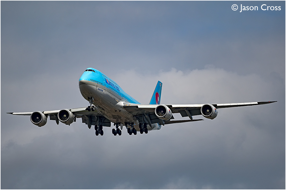 Korean Air Boeing 747 HL7633 on final approach to Heathrow with flight KAL907 from Seoul. Date: 13 July 2024 Manipulation Notes: None