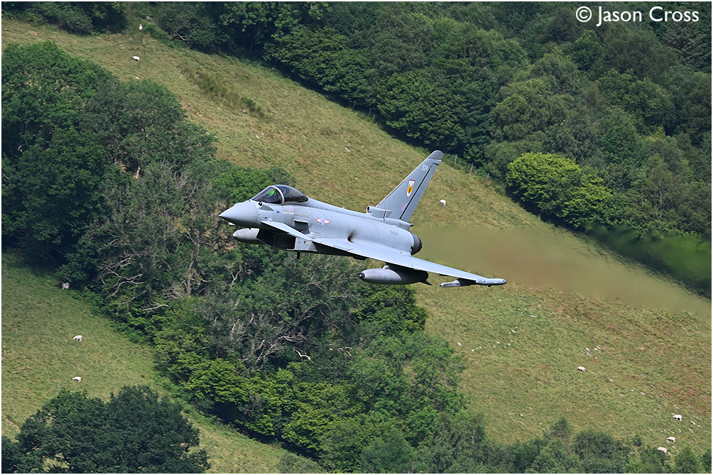 Royal Air Force Eurofighter Typhoon FGR4 ZK324, two-ship flight from RAF Coningsby, callsign CHAOS (3 Squadron). Mach Loop, Wales (taken from Bluebell). Date: 17 July 2024 Manipulation Notes: None
