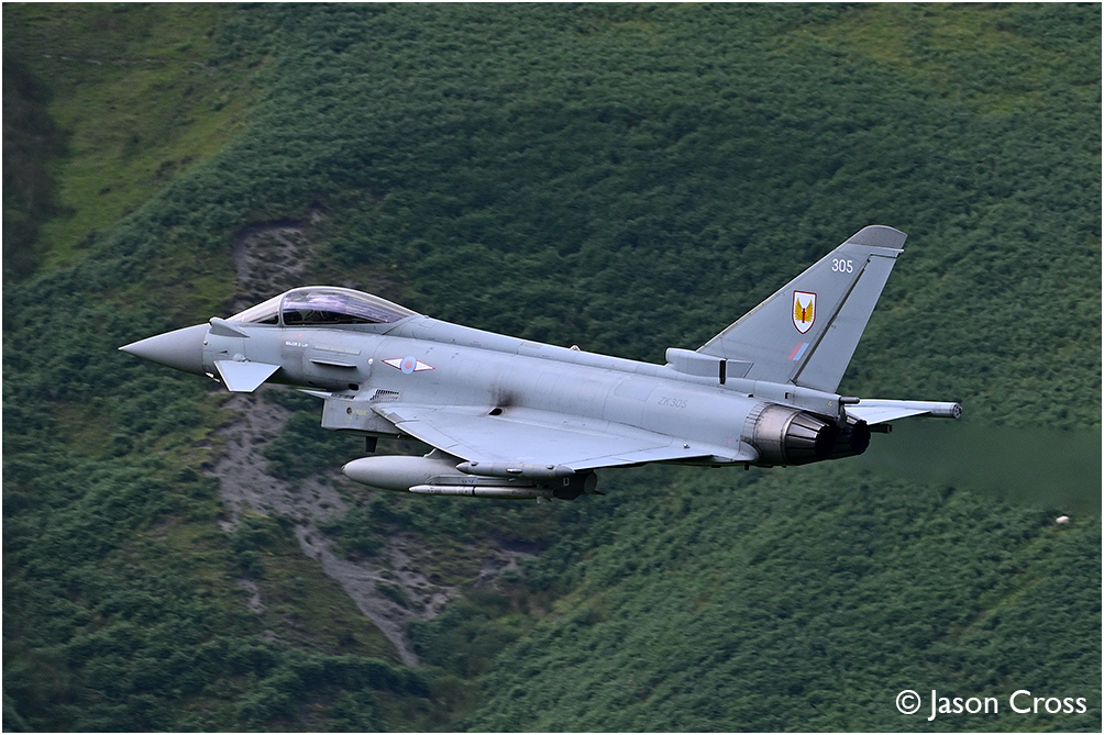 Royal Air Force Eurofighter Typhoon FGR4 ZK305, two-ship flight from RAF Coningsby, callsign CHAOS (3 Squadron). Mach Loop, Wales (taken from Bluebell). Date: 17 July 2024 Manipulation Notes: None
