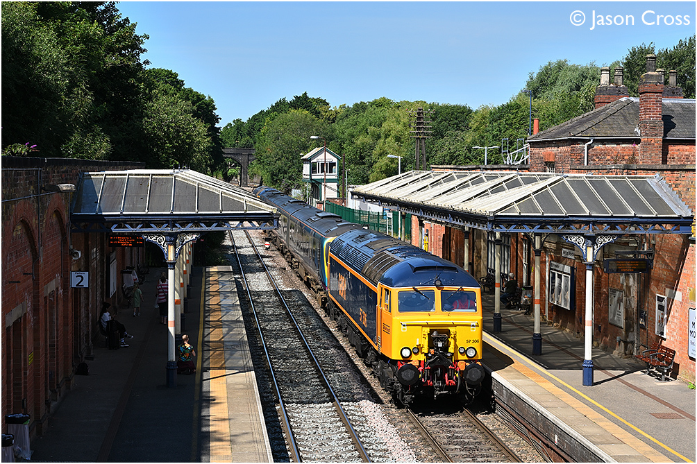 57306 and 57310 top and tail 185118 running as a 5Q85 1125 Asfordby Test Centre (RIDC Melton) to Stockport. The class 185 had been at RIDC Melton for brake testing. Date: 18 July 2024 Manipulation Notes: None