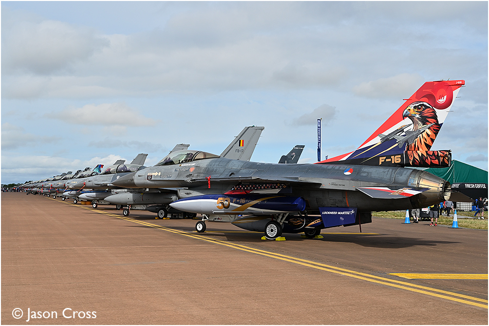 Royal Netherlands Air Force, General Dynamics F16A, J-616 leads a line up of F16s. Royal International Air Tattoo (RIAT), RAF Fairford. Date: 21 July 2024 Manipulation Notes: None