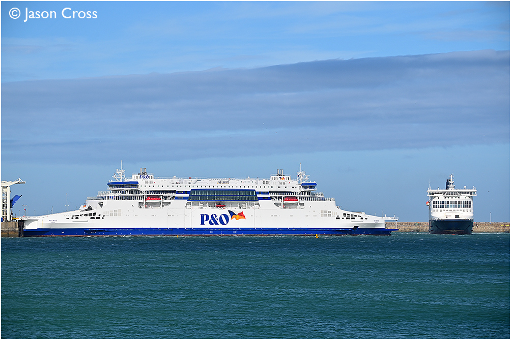 'Delft Seaways' turns inside Dover harbour with a sailing from Dunkerque, while 'P&O Liberte' waits to depart for Calais. Date: 15 August 2024 Manipulation Notes: None