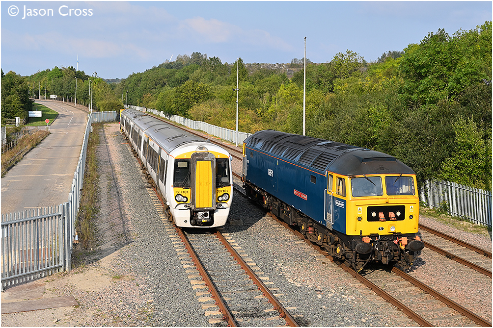47749 'City of Truro' and 387101 in the yard at the Asfordby Test Centre (RIDC Melton). Date: 20 September 2024 Manipulation Notes: None Camera mounted on a tall pole and remotely fired