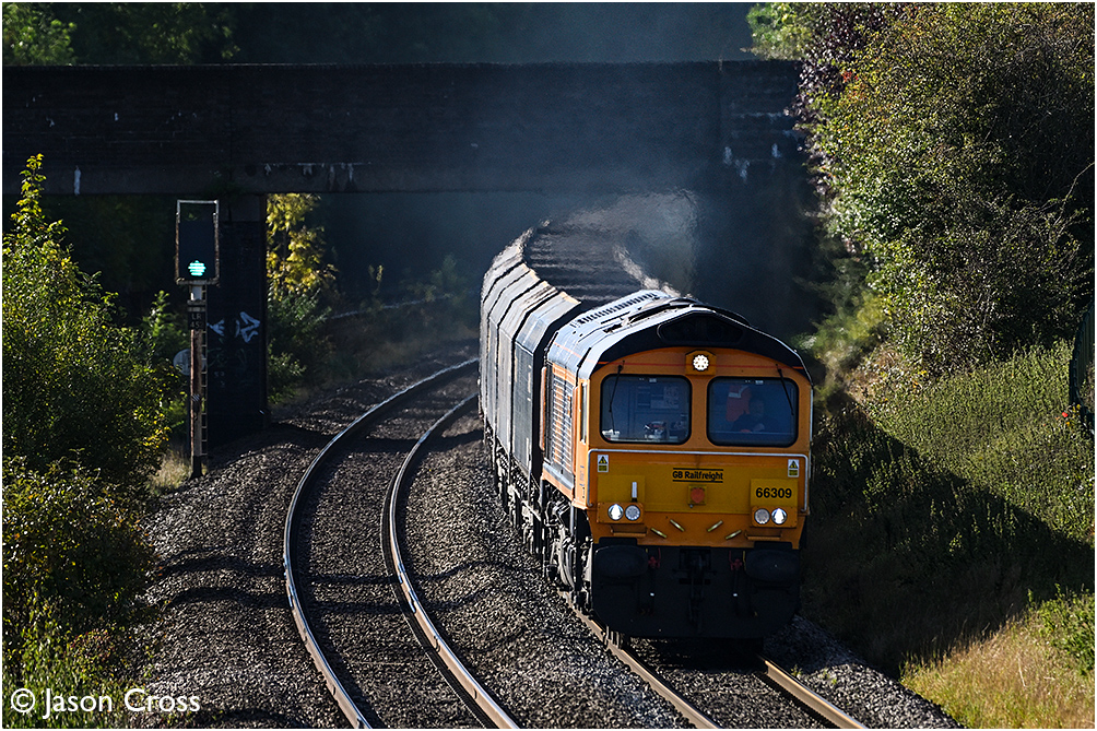 66309 'Charley Wallace' heading north at Thurmaston in charge of the 4H73 0551 Washwood Heath Up Siding to Tunstead Sidings. Date: 3 October 2024 Manipulation Notes: None
