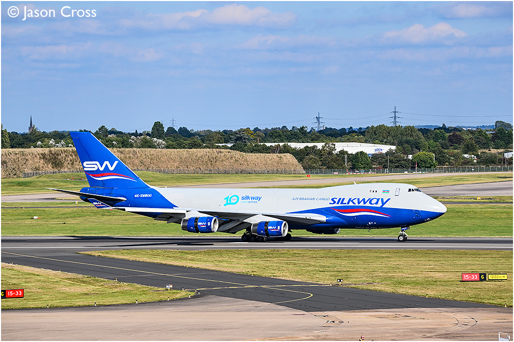 Silkway West Airlines Boeing 747, 4K-SW800 landing cargo flight from Chicago O'Hare Airport. Birmingham Airport. Date: 5 October 2024 Manipulation Notes: None