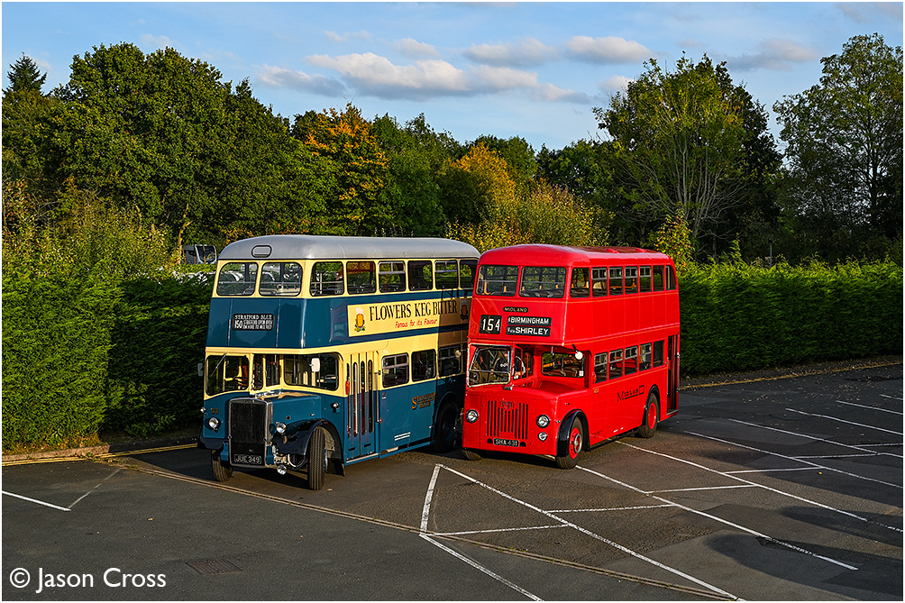 Stratford Blue Leyland PS2 number 33 and Midland Red Leyland Titan PD2 number 4031. David Williams photo charter at Wythall Transport Museum. Date: 5 October 2024 Manipulation Notes: None Camera mounted on a tall pole and remotely fired