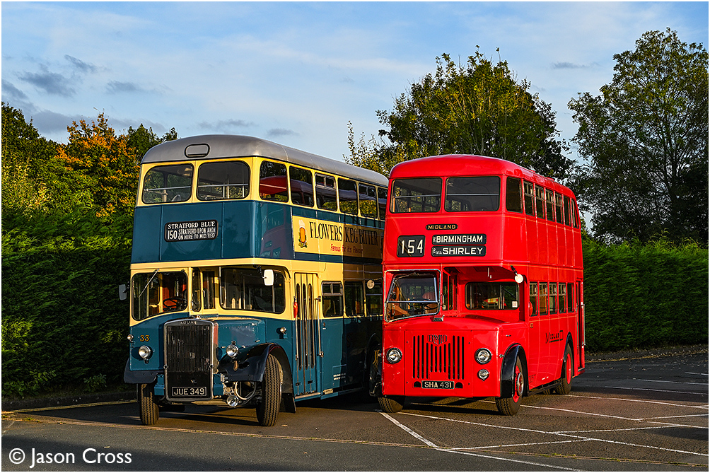 Stratford Blue Leyland PS2 number 33 and Midland Red Leyland Titan PD2 number 4031. David Williams photo charter at Wythall Transport Museum. Date: 5 October 2024 Manipulation Notes: None