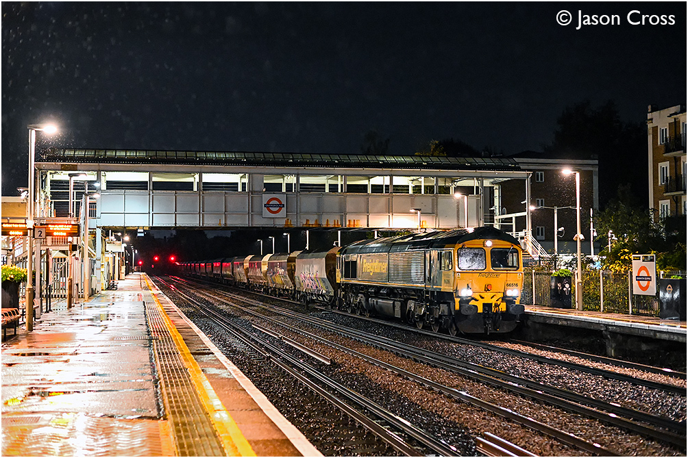 66516 passes through a very wet Kensington Olympia with the 6O26 0331 Hanwell Bridge Loop to Purley Yard stone train. Date: 14 October 2024 Manipulation Notes: None
