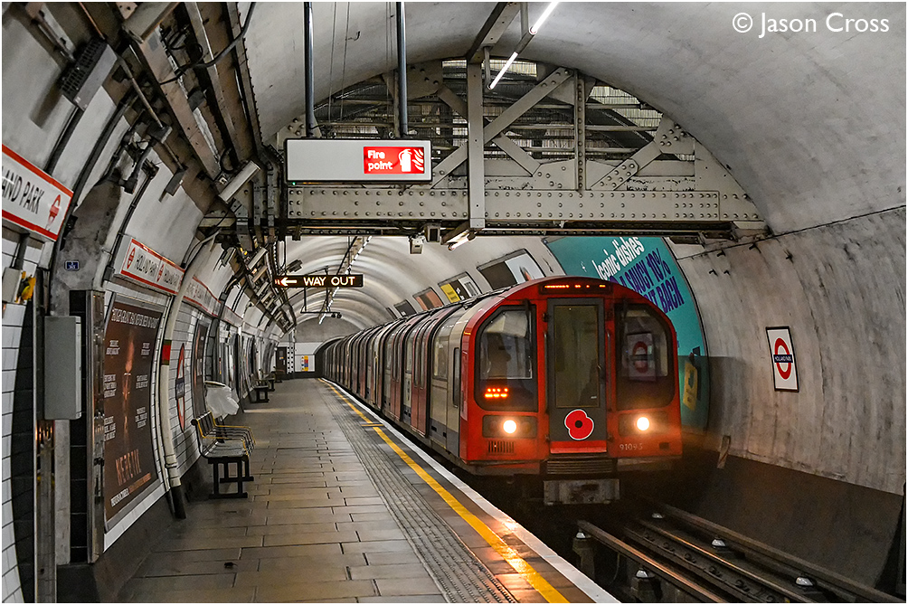 91093 leads a train of 1992 Tube Stock into Holland Park on the eastbound. Date: 28 October 2024 Manipulation Notes: None