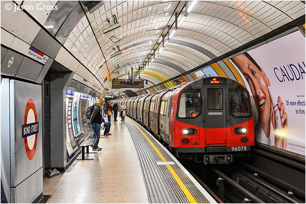 96078 leads a train of 1996 Tube Stock into Bond Street with a Stratford to Stanmore Jubilee Line service. Date: 28 October 2024 Manipulation Notes: None