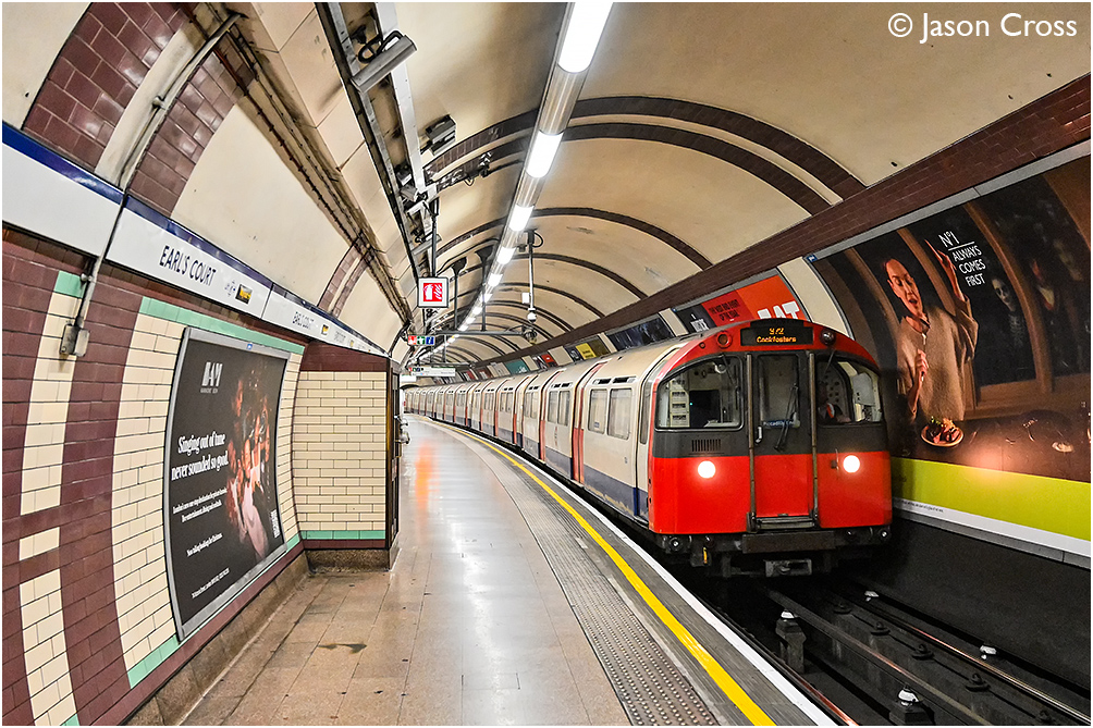 A Piccadilly Line train of 1973 Tube Stock formed 184-584-384+383-583-183 arrives at Earl's Court with a Heathrow Terminal 4 to Cockfosters service. Date: 29 October 2024 Manipulation Notes: None