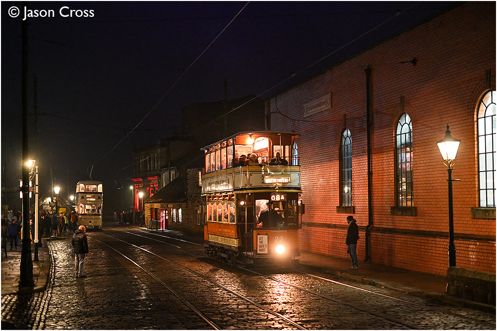 Glasgow Corporation 'Standard' number 22 passing the workshops. Crich Tramway Village - 'A Journey Through Time & Light' event. Date: 10 November 2024 Manipulation Notes: None