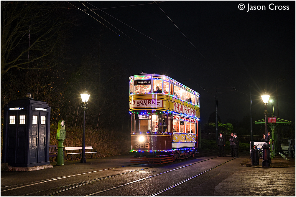 Leeds City Transport 399 waits to depart from the Town End terminus. Crich Tramway Village - 'A Journey Through Time & Light' event. Date: 10 November 2024 Manipulation Notes: None
