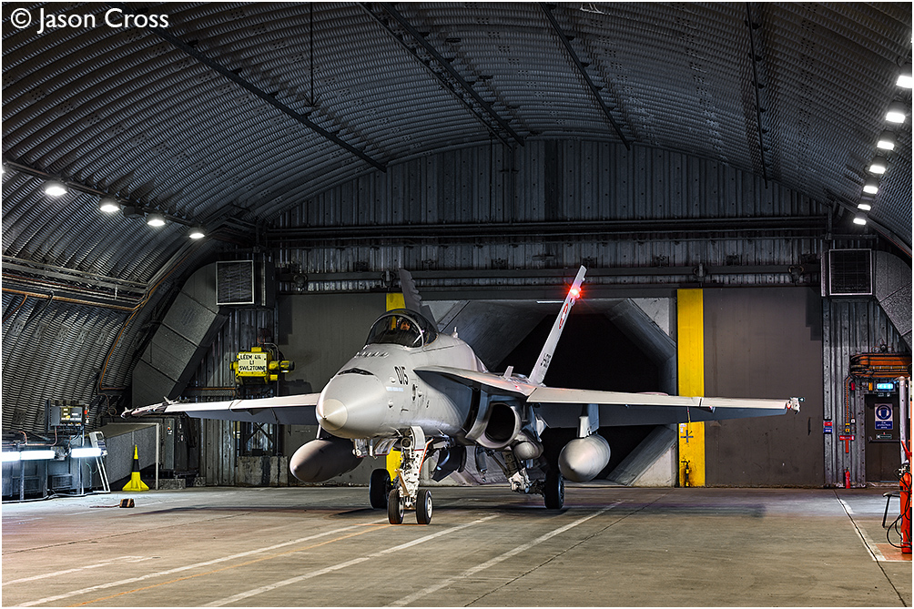 Canopy closed, McDonnell Douglas F/A-18C Hornet J-5015 is about to exit its HAS to taxi out for an evening sortie. 'Yorknite 2024' deployment of Hornets of the Swiss Air Force to RAF Leeming. Date: 14 November 2024 Manipulation Notes: None