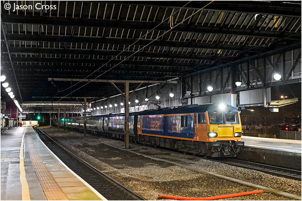 92020 'Billy Stirling' passes through Stoke-on-Trent with the 1S25 Euston to Aberdeen, Inverness and Fort William Caledonian Sleeper, diverted via Stoke due to engineering works near Crewe. Date: 29 December 2024 Manipulation Notes: None