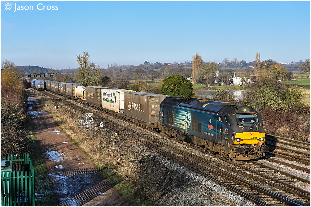68034 'Rail Riders' powers over Trowell Junction with a diverted 4Z27 0538 Coatbridge to Daventry container train. Date: 11 January 2025 Manipulation Notes: None