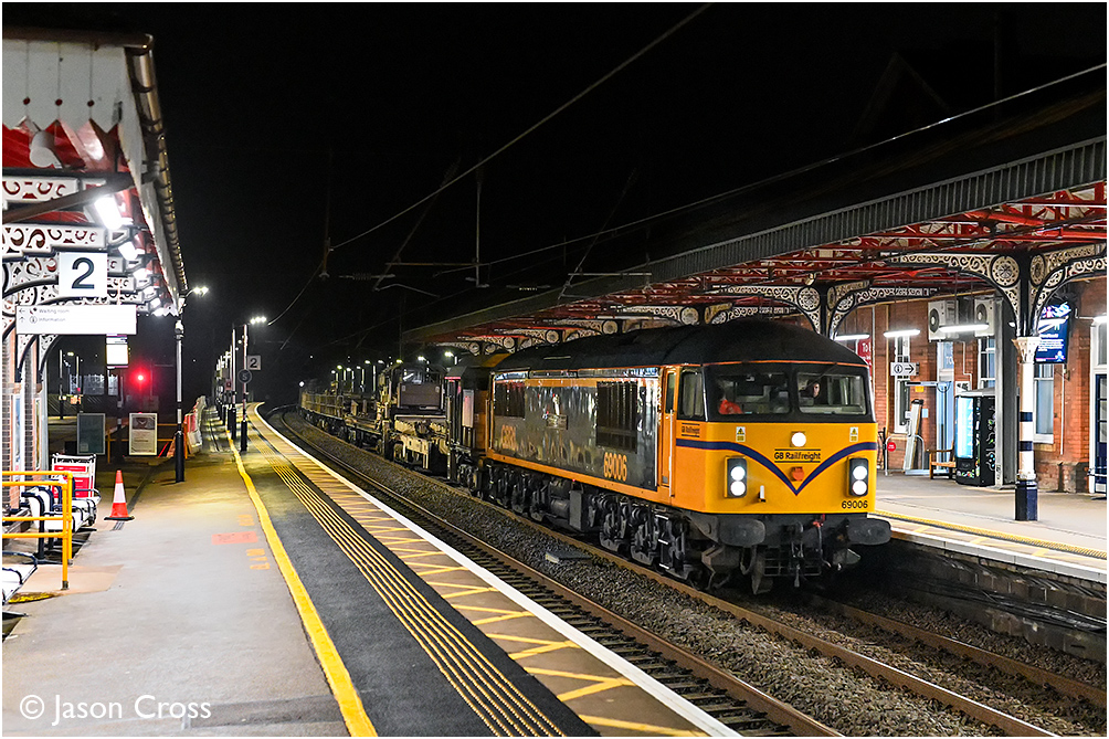69006 'Pathfinder Railtours' passing Grantham with the 6L84 2141 Doncaster Up Decoy to Whitemoor Yard. Date: 17 January 2025 Manipulation Notes: None