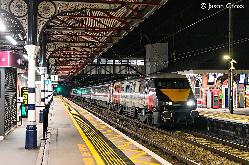 91111 'The Fallen' slows to call at Grantham while working the 1N36 2300 London Kings Cross to York service. Date: 18 January 2025 Manipulation Notes: None