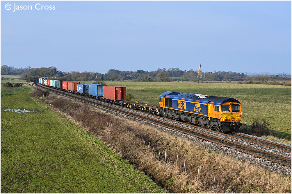66305 approaches Melton Mowbray at Copley's Brook with the 4L05 0520 Ditton to Felixstowe North container train. Date: 17 February 2025 Manipulation Notes: None Camera mounted on a tall pole and remotely fired