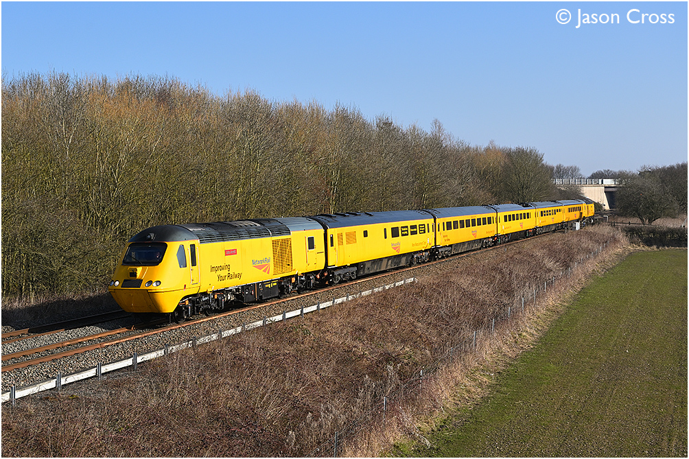 43062 and 43013 race towards Stenson Junction with a 1Z49 0925 Derby RTC to Reading Triangle Sidings NMT working. Date: 6 March 2025 Manipulation Notes: None Camera mounted on a tall pole and remotely fired