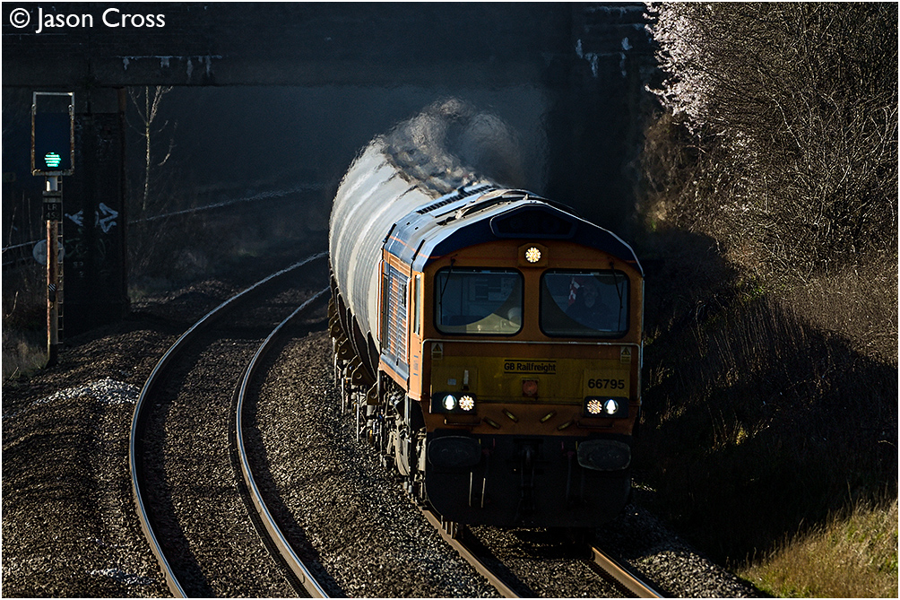 66795 'Bescot LDC' passes Thurmaston with the 6M72 0309 Grain Oil Terminal to Sinfin Sidings aviation fuel. Date: 20 March 2025 Manipulation Notes: None