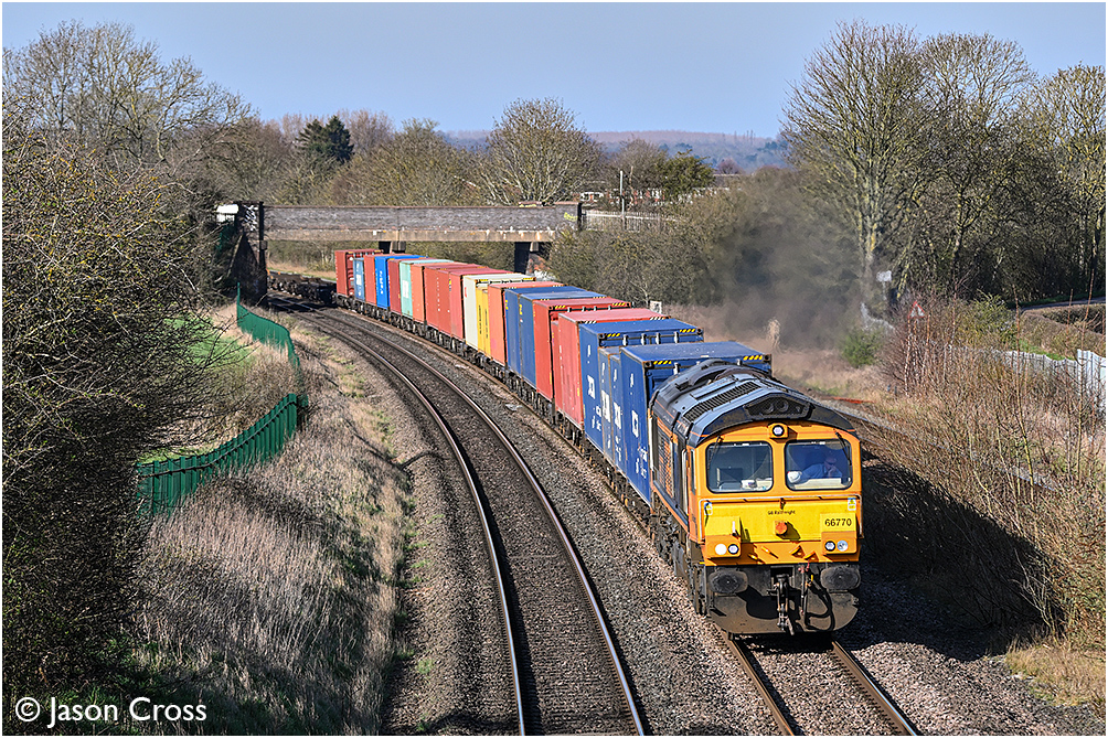 66770 'Darius Cheskin' on the up fast at Thurmaston with the 4M23 1046 Felixstowe North to Birch Coppice container train. Date: 26 March 2025 Manipulation Notes: None