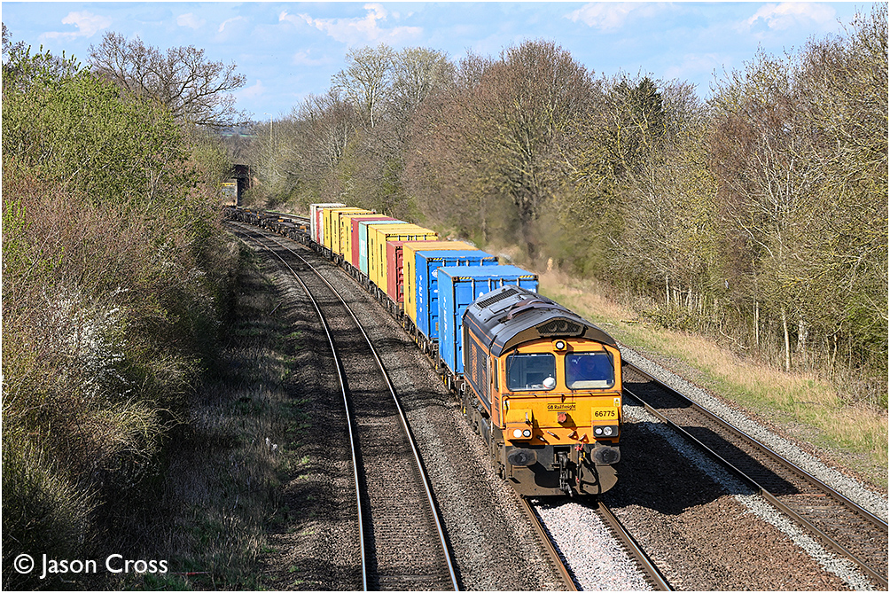 66775 'HMS Argyll' pulling away from Syston South Junction with the 4M29 1028 Felixstowe North to Hams Hall container train. Date: 27 March 2025 Manipulation Notes: None