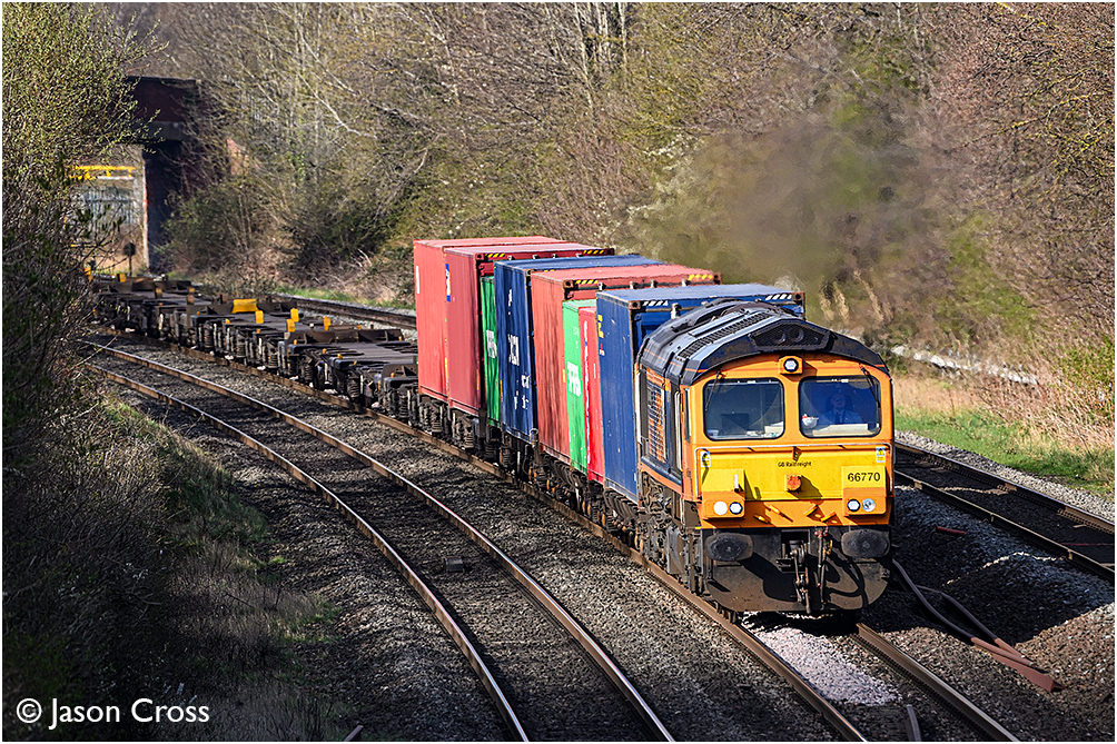 66770 'Darius Cheskin' pulling away from Syston South Junction with the 4M23 1046 Felixstowe North to Birch Coppice container train. Date: 27 March 2025 Manipulation Notes: None