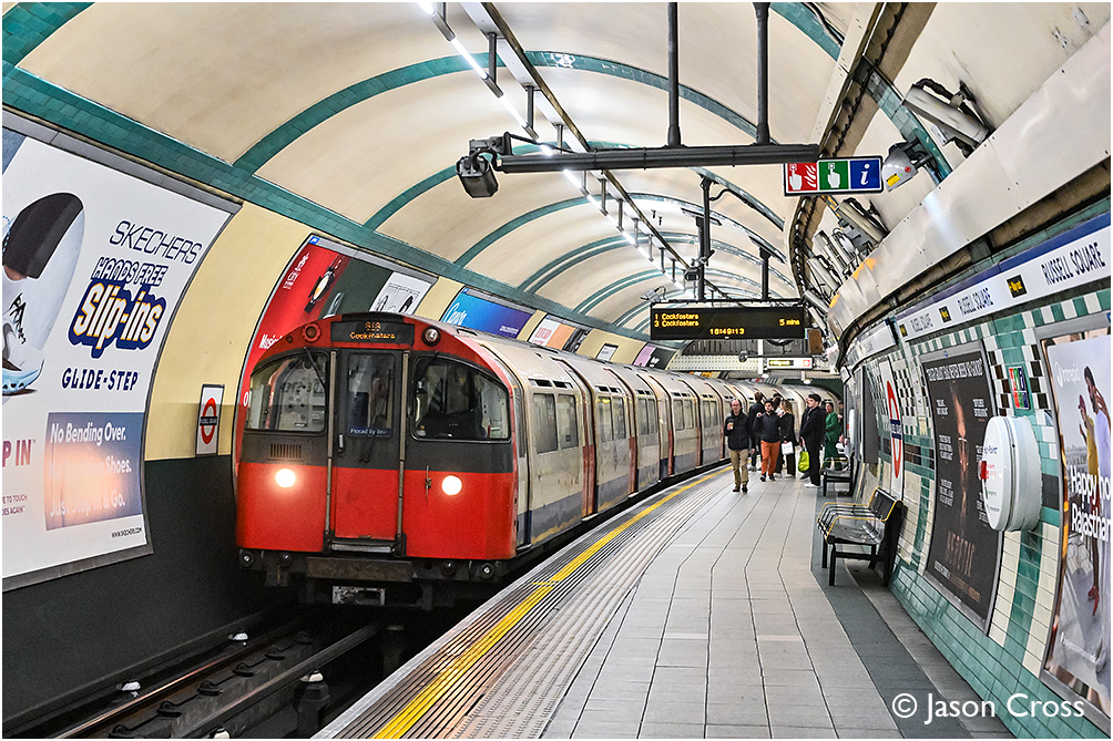 1973 Tube Stock 198-598-398+343-543-143 arrives at Russell Square with a Heathrow Terminal 4 to Cockfosters Piccadilly Line service. Date: 29 March 2025 Manipulation Notes: None