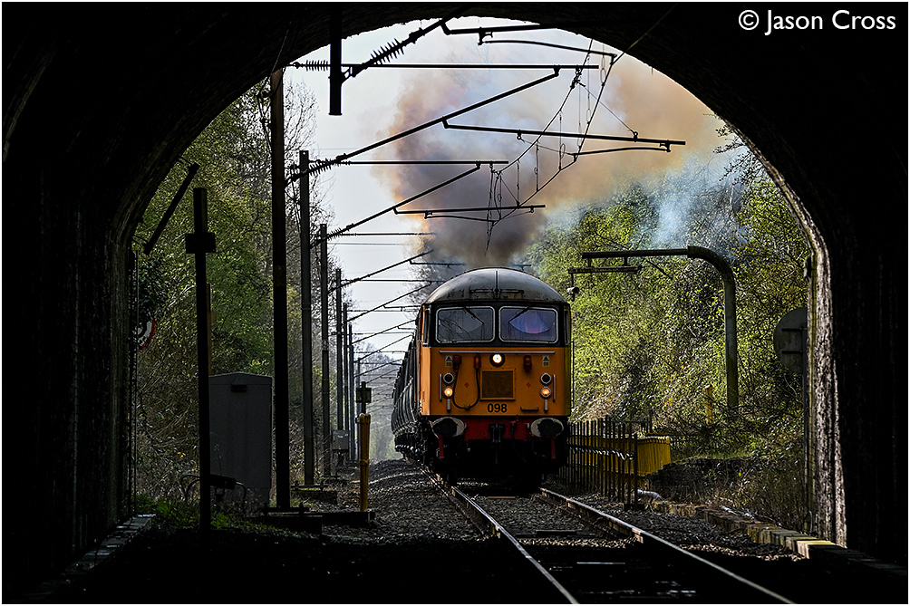 56098 breasts the summit of the Old Dalby test track as it approaches Grimston Covered Way with two class 730s in tow. (Picture taken from a position of safety). Date: 5 April 2025 Manipulation Notes: None